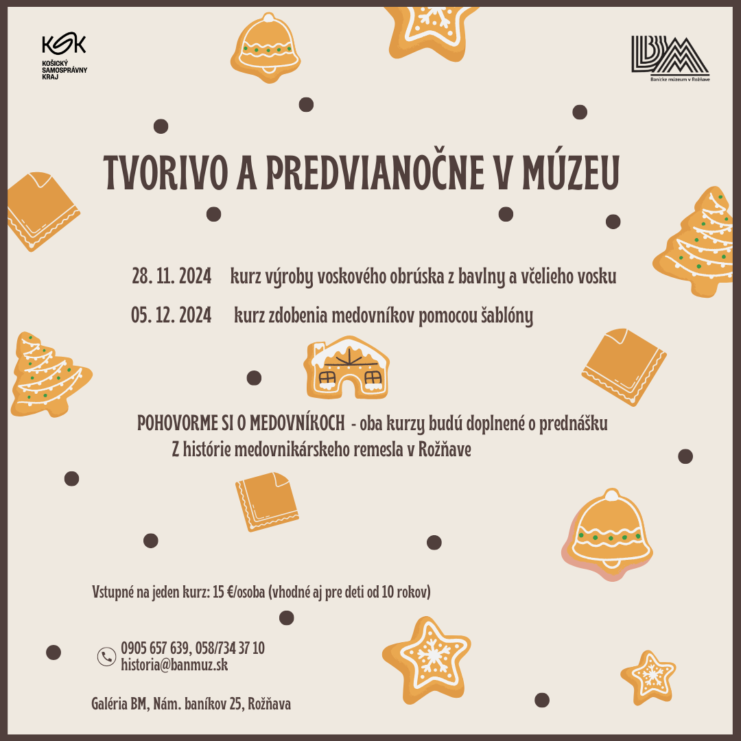 Pozývame Vás na predvianočné tvorenie: 28.11.20214 - kurz výroby voskového obrúsku z bavlny a včelieho vosku 5.12.2024 - kurz zdobenia medovníkov pomocou šablóny Kurzy budú prebiehať v Galérii BM a je potrebné sa na ne vopred prihlásiť. Tešíme sa na Vás! |